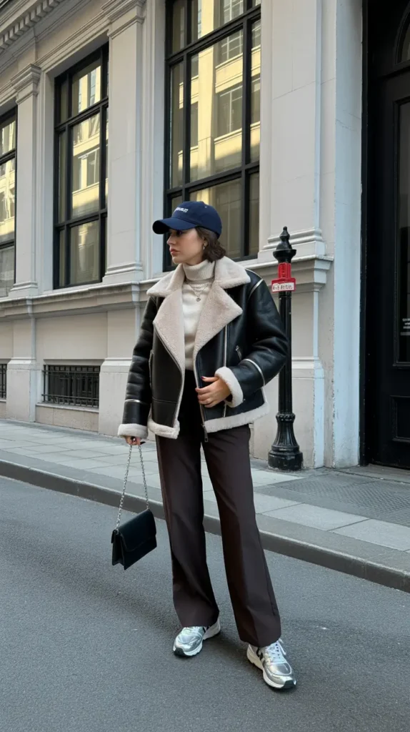 Sporty-luxe done right: a black shearling biker, cream roll-neck, relaxed brown trousers, and performance sneakers. Finish with a navy cap and a crossbody chain bag.