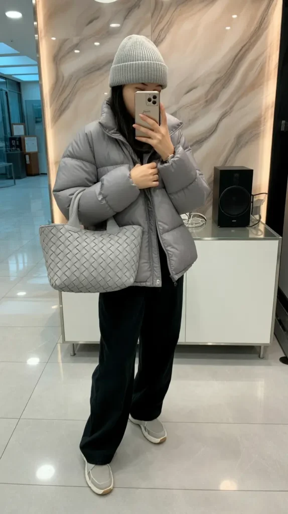 All-gray tones = instant sophistication. Pair a matte-finish puffer with matching beanie, loose black trousers, and understated sneakers. A woven tote adds polish.