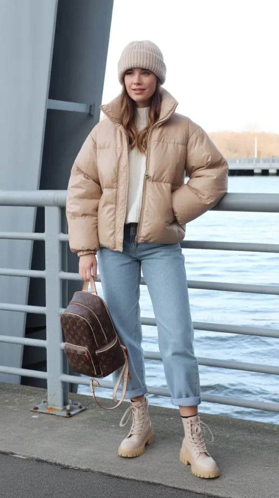 Neutral warmth with utility: a sandy puffer, cream knit, cuffed straight-leg jeans, ribbed beanie, and lace-up lug boots. Add a cocoa-toned backpack for balance.