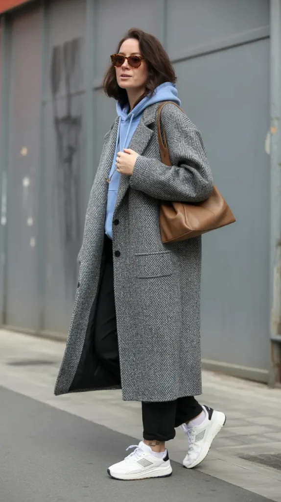 The ultimate high-low combo: a tailored herringbone coat layered over a sky-blue hoodie, cropped trousers, and crisp trainers. Perfect for casual Fridays or coffee runs.