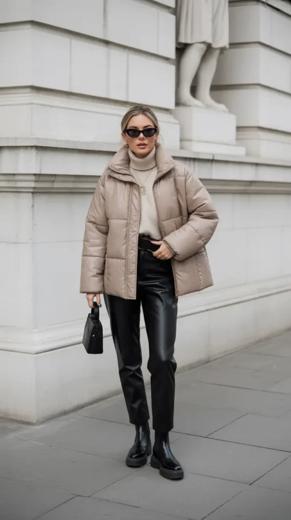 An office-to-evening staple: taupe puffer, sleek leather trousers, block-heeled Chelsea boots, and a structured top-handle bag.