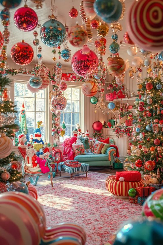 Dive headfirst into bold maximalist decor. Layer vibrant tinsel, mix vintage bows with glittery garlands, and play with unexpected color pairings. Whether you love retro flair or modern glam, this over-the-top approach guarantees a joyful, show-stopping display.
