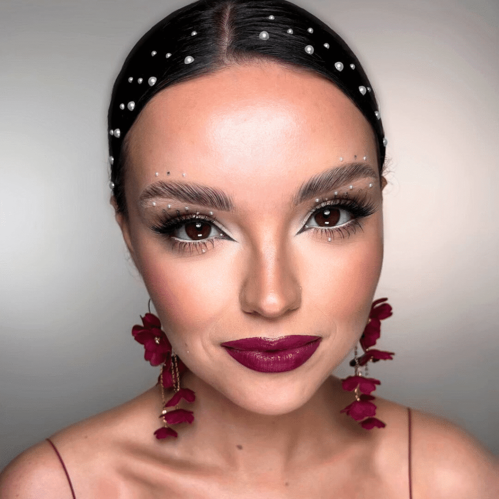 This look is holiday perfection. Winged eyeliner, fluttery lashes, bold brows, and a rich berry-burgundy lip create a luxe vibe. Add pearl hair accessories and statement earrings for the ultimate festive finishing touch.