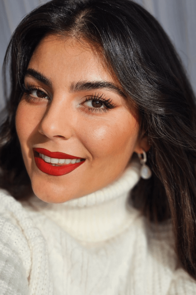 Flirty lashes and a vibrant red lip are all you need to turn heads this season. This look embodies that effortless “model off duty” energy but with a festive twist.
