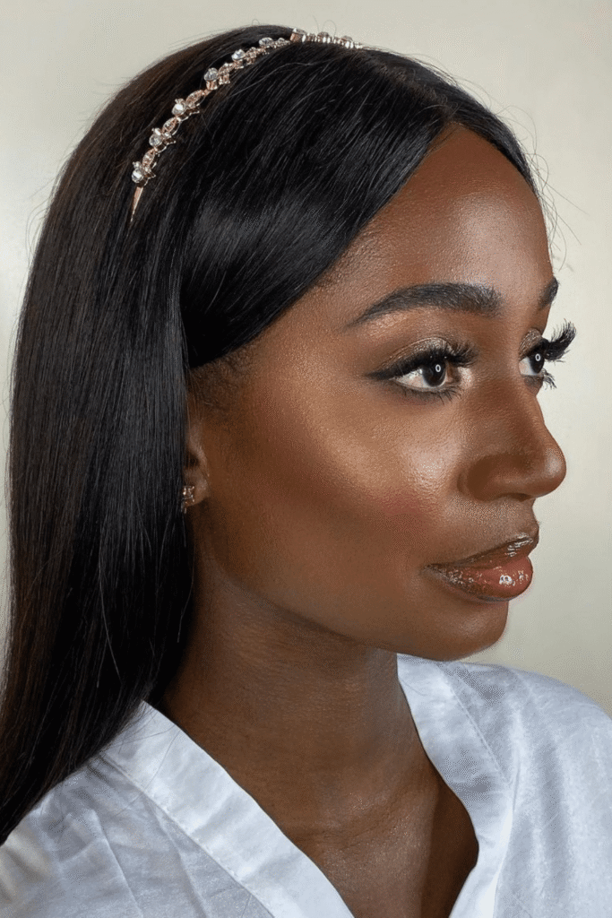 A dreamy look that radiates elegance on deeper skin tones. Highlight your best features with a luminous highlighter, finish with glossy lips, and top it off with a jeweled headband for that “modern-day snow princess” vibe. Perfect for holiday dinners or winter weddings.