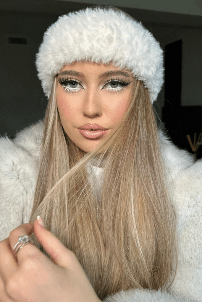 White mascara? Yes, please! Paired with glossy pink lips, a fluffy white hat, and a winter coat, this look gives off rich snow bunny vibes. Chic, cozy, and playful all at once—ideal for snowy holiday adventures.