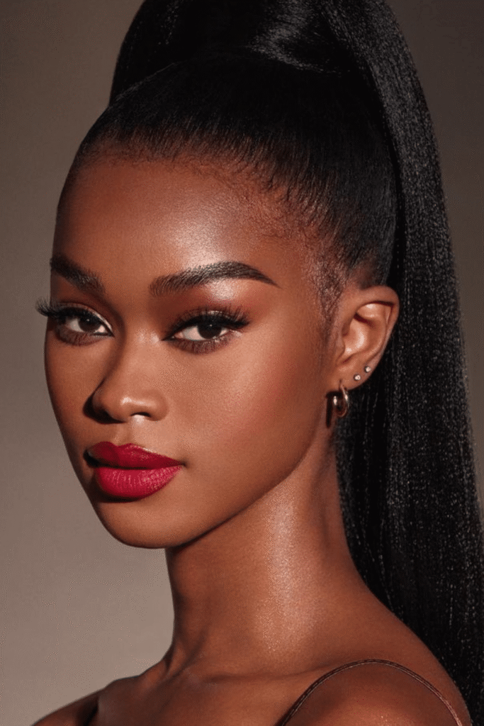The holidays aren’t complete without a little green. Sweep on a shimmering emerald shadow, balance it with a nude glossy lip, and add festive hair ribbons for that wow factor. A playful yet sophisticated nod to Christmas colors.