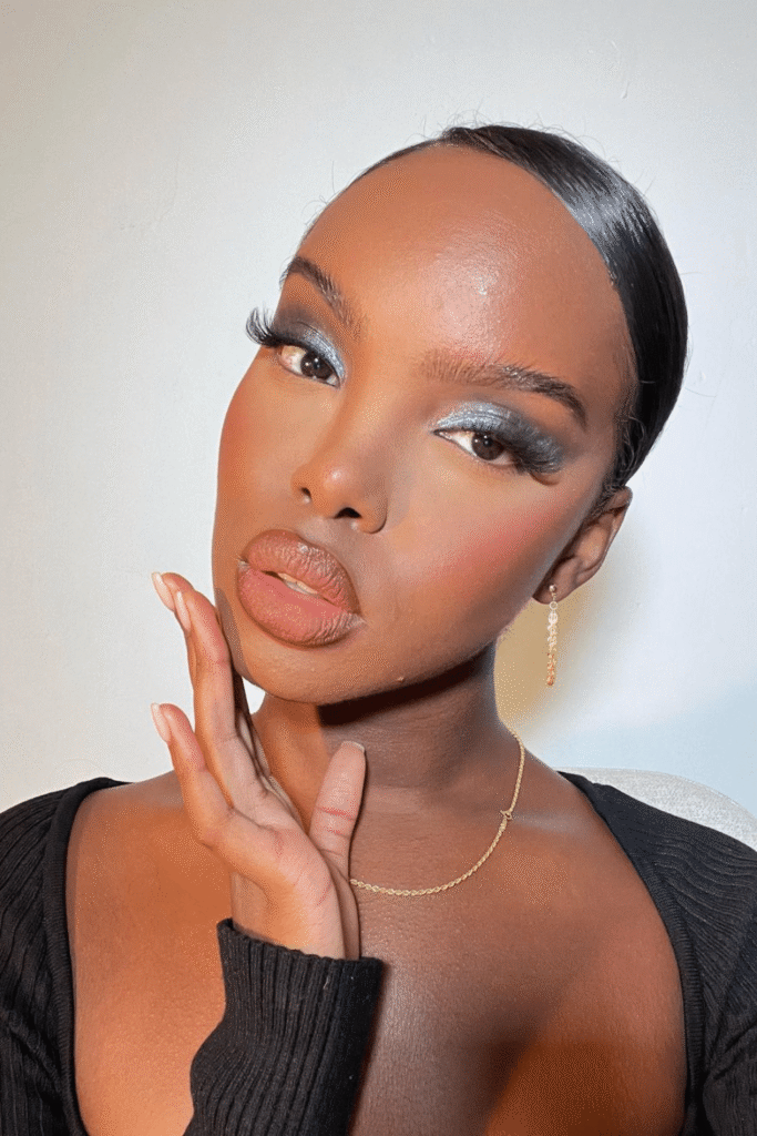 Bring on the glitter! This look leans into metallic silver eyeshadow, paired with a soft matte lip for balance. Stunning on deep skin tones, but adaptable for every complexion, it’s a statement-making beat for the ultimate holiday glam.