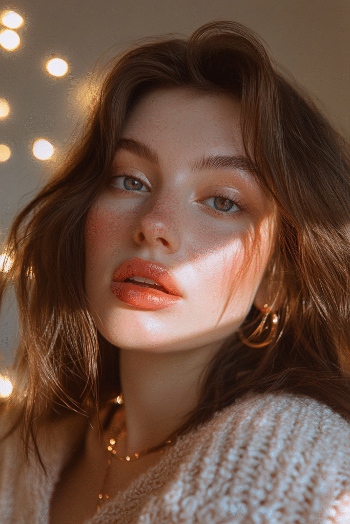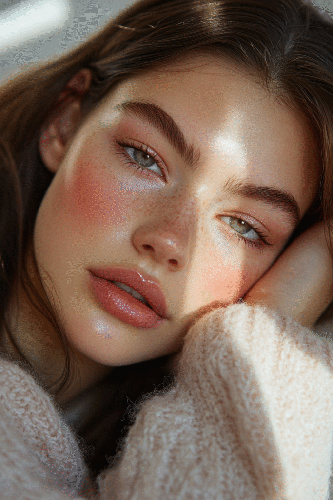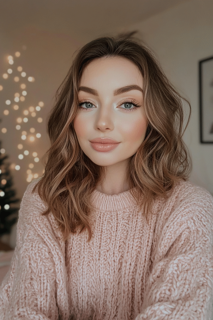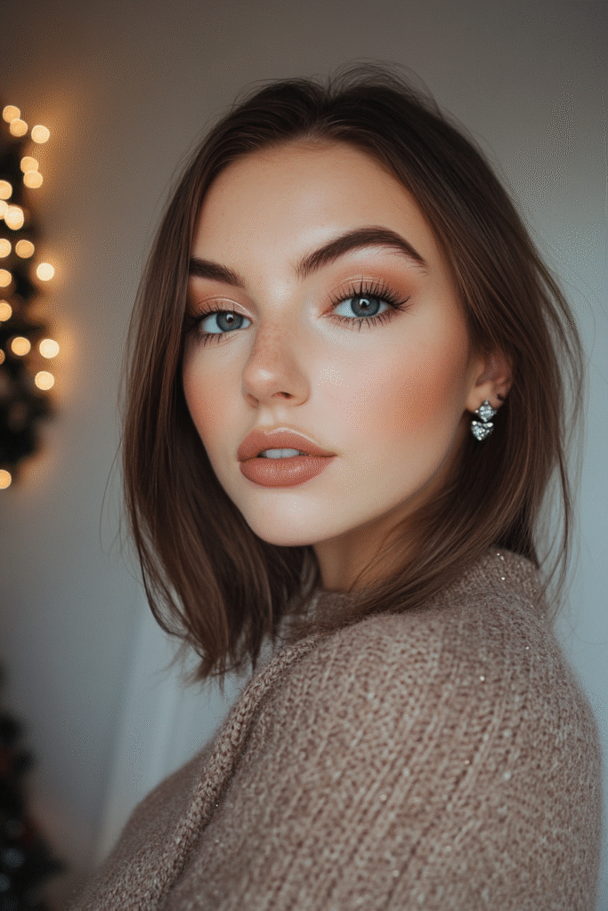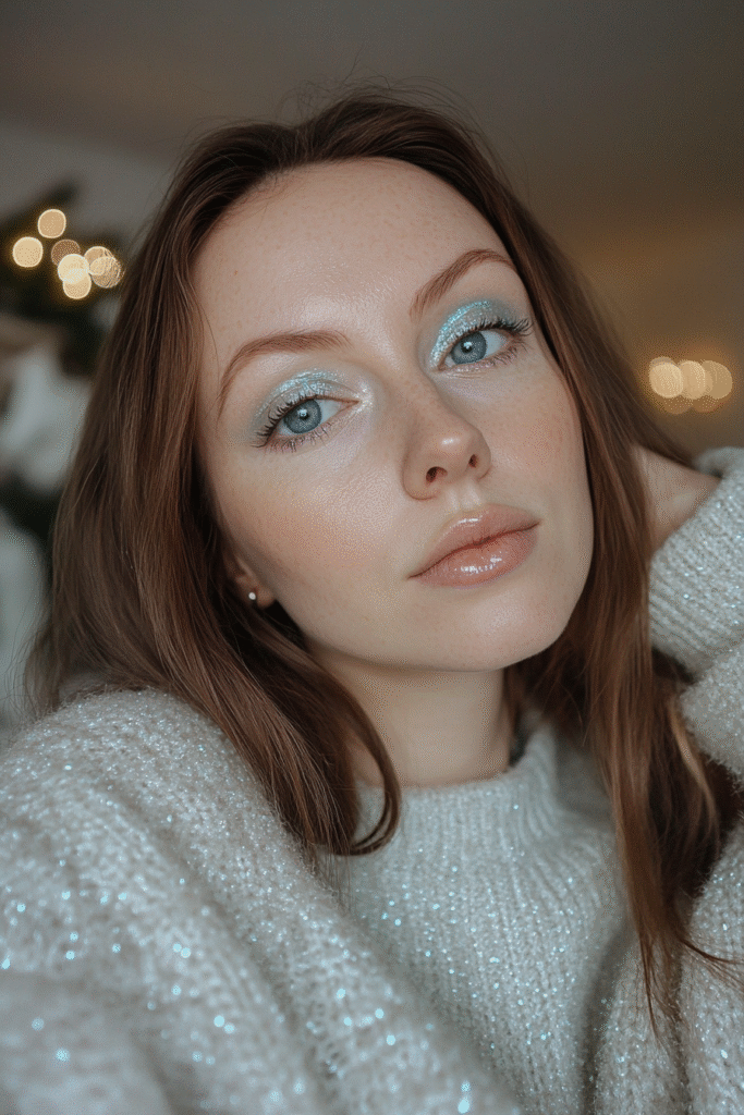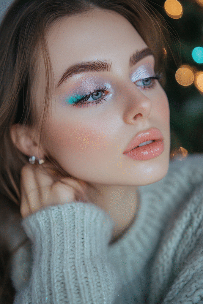 Soft pink shadows paired with a luminous highlight create a romantic winter look. Add a glossy peach or pink lip and a hint of sparkle on the inner corners for a dreamy finish.
