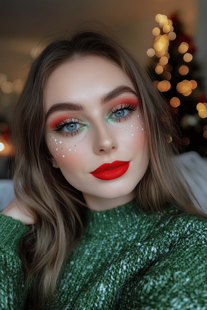Get playful with bright reds and greens. Add fun accents like tiny dots or whimsical details under the eyes. Finish with a shiny red lip for a spirited, elf-inspired vibe.