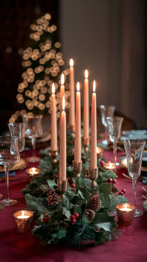 Create a serene, snowy scene using white candles, silver ornaments, frosted pinecones, and soft greenery. The result is timeless, elegant, and perfect for a formal Christmas dinner.