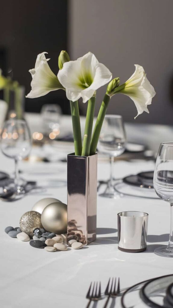 Sleek vases, monochrome color palettes, and geometric shapes create a contemporary holiday look.