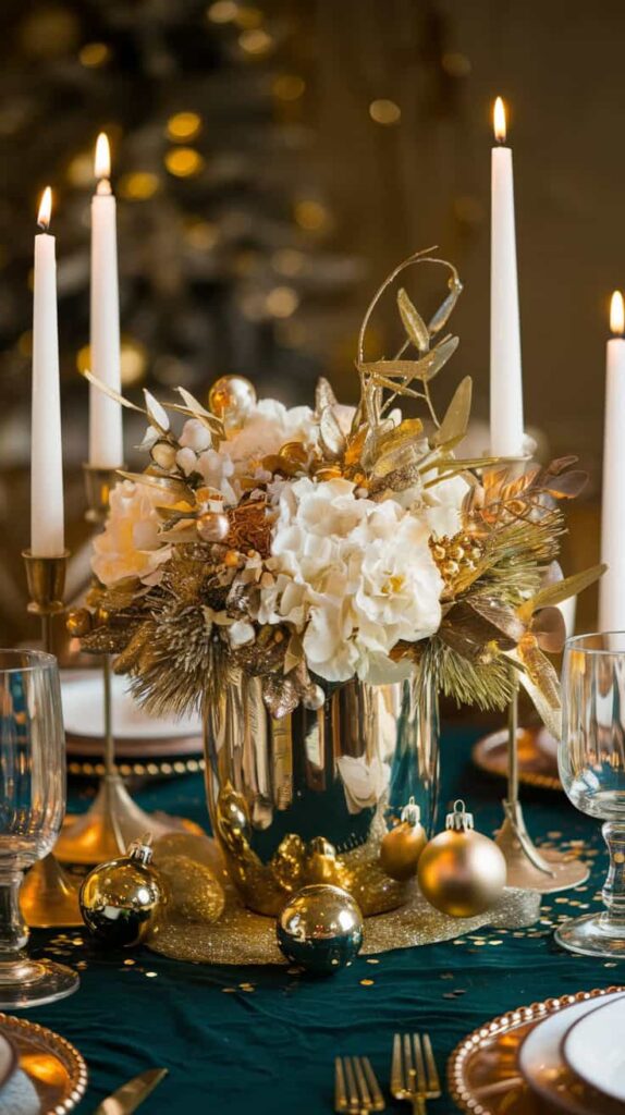 Gold accents, gilded pinecones, and metallic candle holders bring richness and warmth to your table.