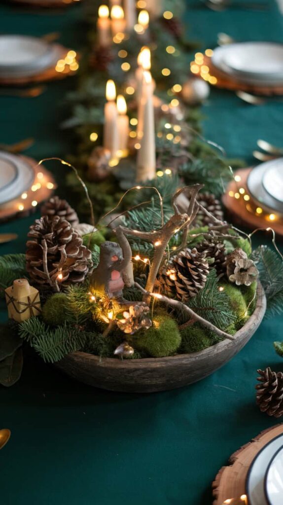 Moss, twigs, pinecones, and fairy lights transform your table into a woodland escape.