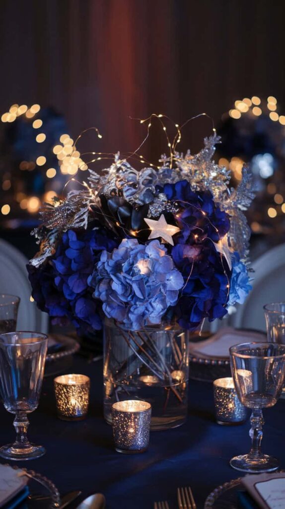 Celestial motifs like stars, moons, silver accents, and soft lighting create a dreamy, nighttime-inspired table.