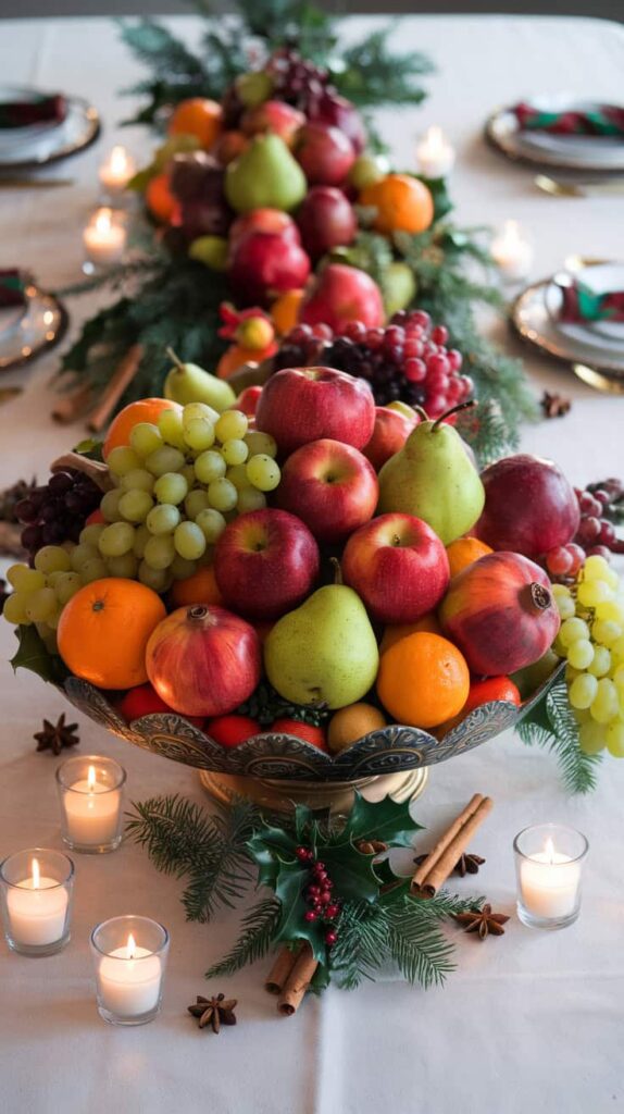 Seasonal fruits such as oranges, pomegranates, apples, and cranberries add color and freshness.