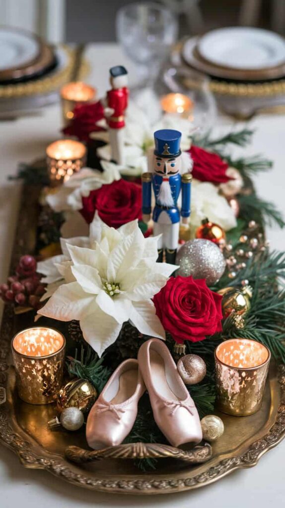 Celebrate the classic ballet with nutcracker figurines, red-and-green accents, and elegant holiday florals.