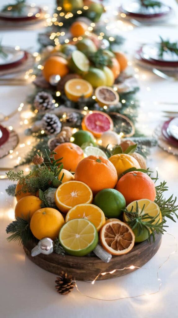 Slices of citrus paired with pine branches and twinkle lights create a bright, refreshing centerpiece.