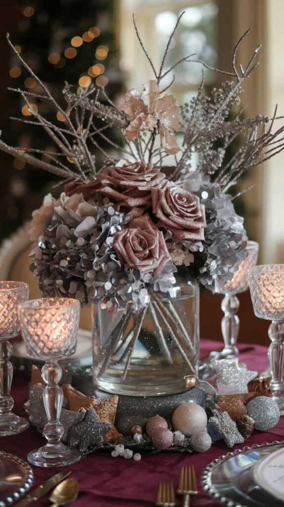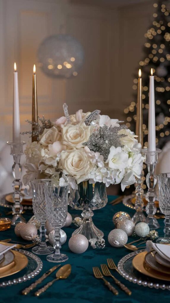 Sparkling crystal ornaments, glass candle holders, and reflective surfaces create a luxurious holiday table.