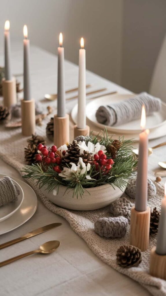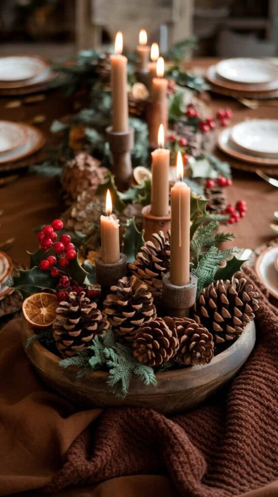 A wooden box filled with pine branches, pinecones, berries, and simple white candles brings warmth and countryside charm to your table.