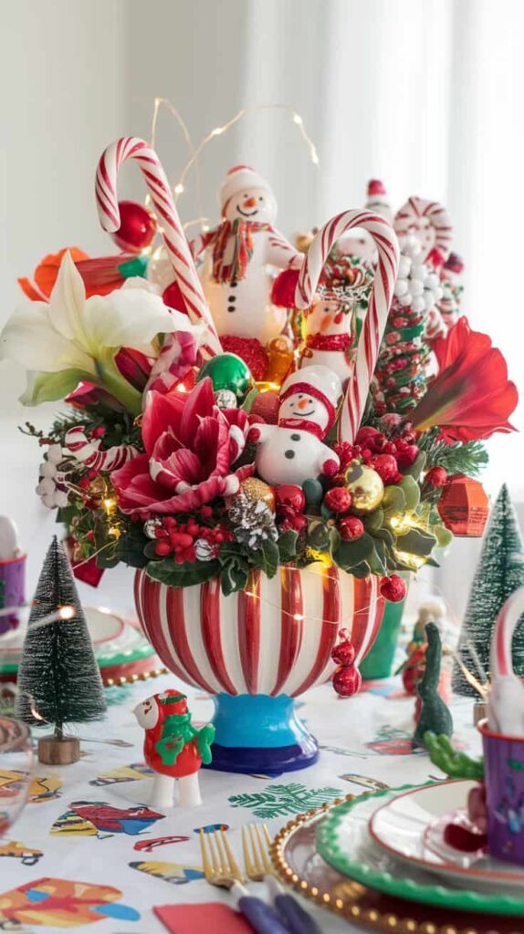 Fairy lights, miniature trees, snowmen, and playful figurines create a magical centerpiece both kids and adults will love.
