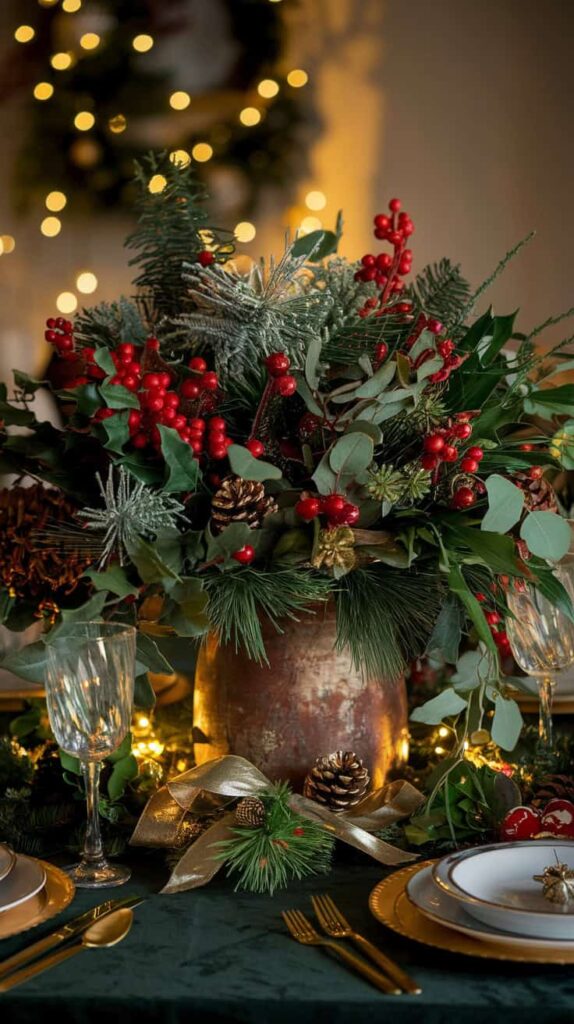 Let greenery take center stage with eucalyptus, holly, mistletoe, and pine branches arranged in varying heights.
