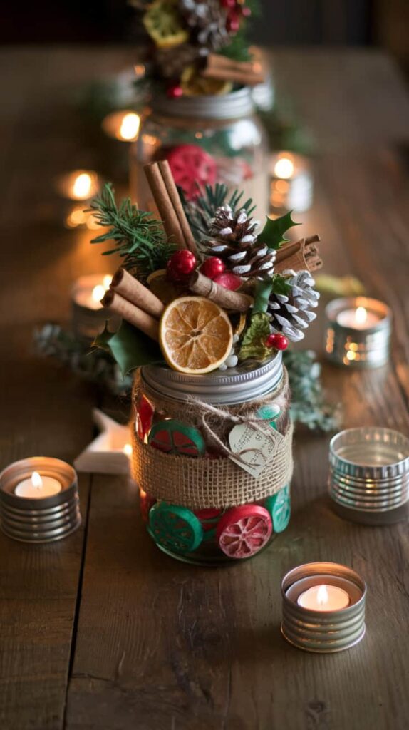 Handmade centerpieces using mason jars, burlap, dried oranges, cinnamon sticks, and greenery add a cozy, personal touch.