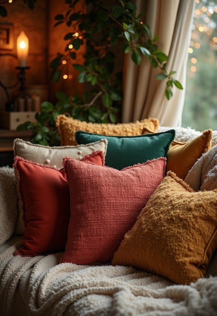 Refresh throw pillows with festive patterns, textures, or personal messages. Mixing shapes and sizes creates cozy, inviting spaces on couches or beds.