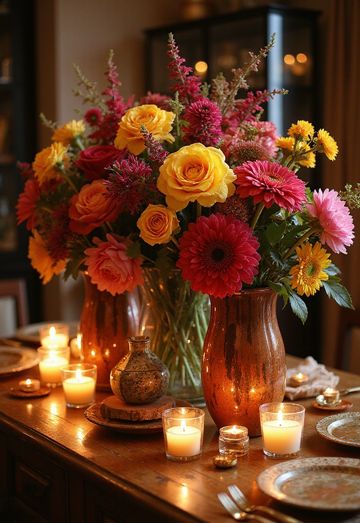 Make your table or mantel the focal point with bold floral arrangements, unique sculptures, or colorful ornaments. Mix heights and textures to create a dynamic display, and incorporate candles for extra ambiance.