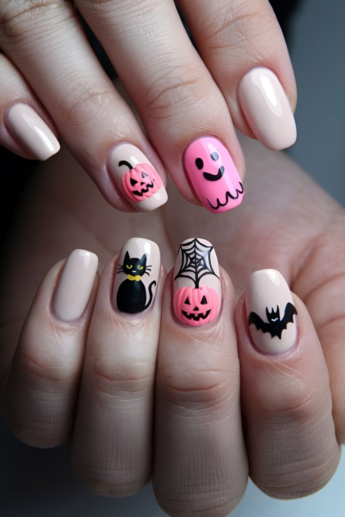 Who says Halloween nails have to be dark? Soft shades like lilac, baby blue, or blush pink bring a fun, unexpected twist to spooky season. Add pastel pumpkins, candy corn, or playful ghosts for a fresh, Instagram-worthy take that easily transitions into November.