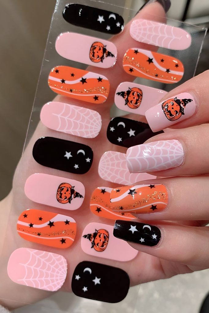 Short on time? Nail stickers and press-ons are your best friend. From intricate spiderwebs to glowing pumpkins, these ready-to-wear designs make it easy to swap styles all month long—no salon required.