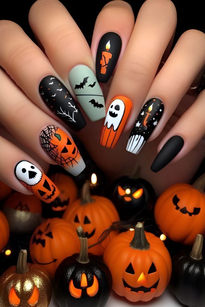 Nothing beats the traditional black-and-orange combo. Pair it with crisp white accents to balance the look, or experiment with candy-corn stripes, checkerboard patterns, and bold geometric shapes for a modern twist. Whether you choose a glossy shine or a chic matte finish, this timeless color palette screams Halloween while staying effortlessly wearable.