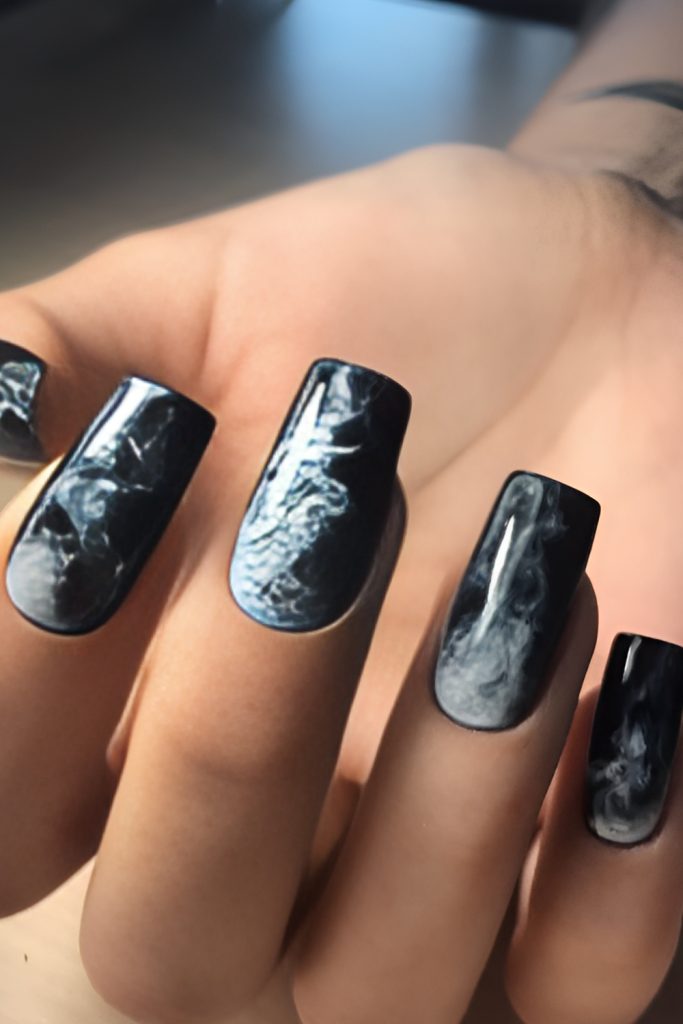 For a mysterious, grown-up vibe, opt for smoky swirls or moody marble nails. Shades of black, charcoal, deep navy, and metallic silver create a stormy, dramatic look—like wearable autumn night skies. Pair with silver jewelry for an edgy, high-fashion finish.