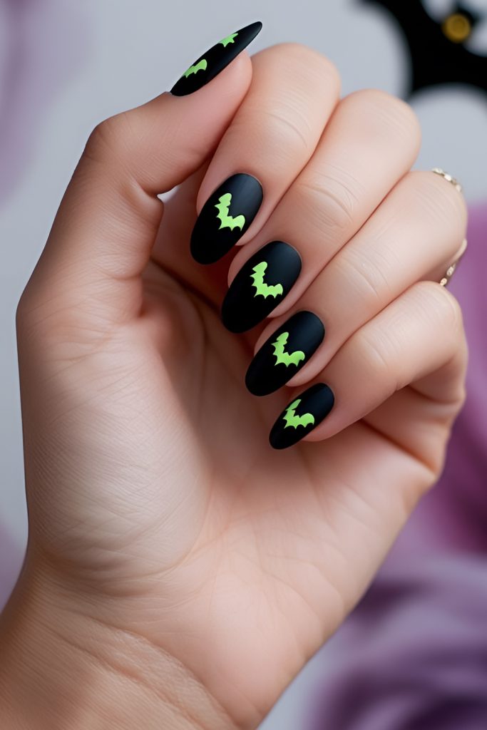 Take your Halloween manicure to the next level with glow-in-the-dark polish. By day, your nails look bright and fun; by night, they light up with an eerie glow. Layer it over neon greens, oranges, or soft pastels, and add spooky details like bats or spiders for double the effect. Perfect for late-night parties or haunted houses.