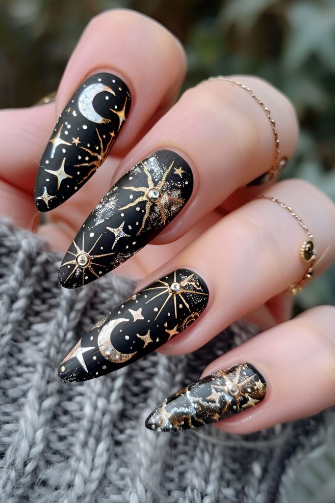 Channel your inner witch with starry skies, crescent moons, and mystical zodiac symbols. A dark base—think midnight purple, deep blue, or jet black—makes metallic gold or silver accents shine. This chic, cosmic style is elegant enough for everyday wear but magical enough for October nights.