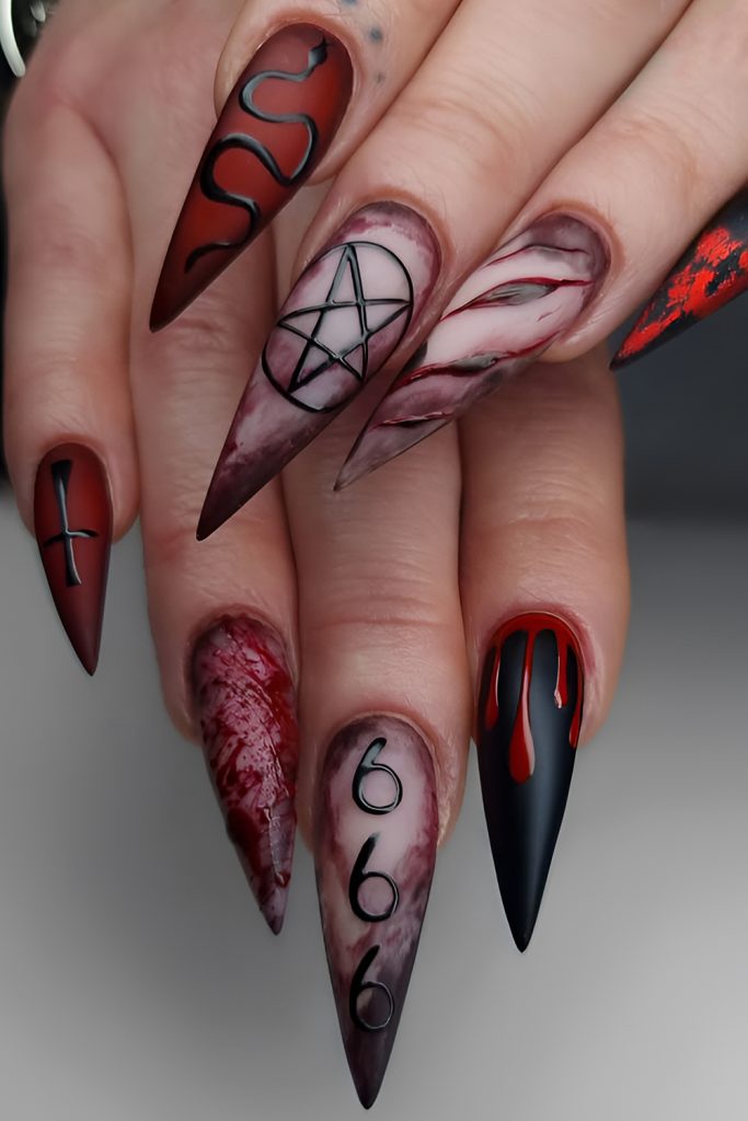 Horror lovers, this one’s for you. Bloody drip designs, splatter effects, and crime-scene-inspired details make for a dramatic, spine-chilling manicure. Matte black or deep red bases add extra impact. Perfect for haunted house visits, horror marathons, or anyone craving a thrill.