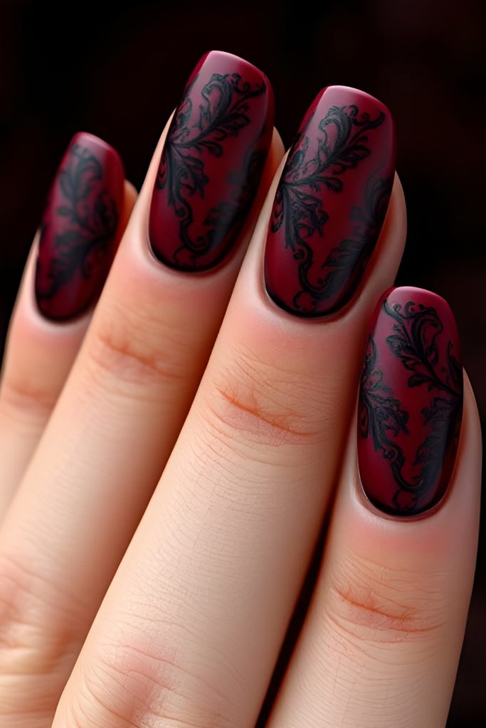 For a dark, romantic style, try black lace over nude or burgundy bases. Matte finishes in deep reds, plums, or charcoal add a sultry vibe, while rhinestones or metallic accents bring extra drama. A perfect mix of elegance and edge for Halloween soirées.