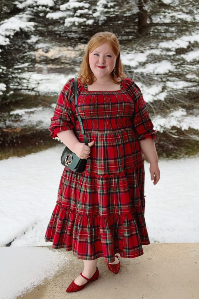I’ve worn this Ivy City Co plaid dress four times already this season! Every time, I get compliments. It’s comfortable, classic, and the size 1X fits perfectly thanks to the stretchy smocked bodice. I styled it with Kendra Scott earrings, a Kate Spade bag (similar linked), and red flats.