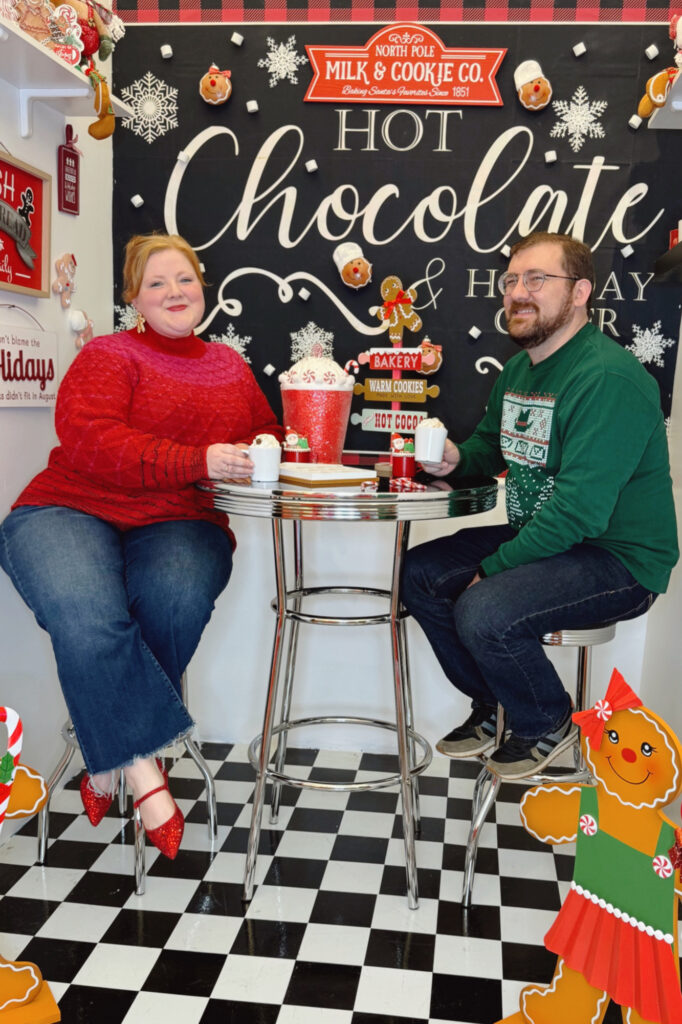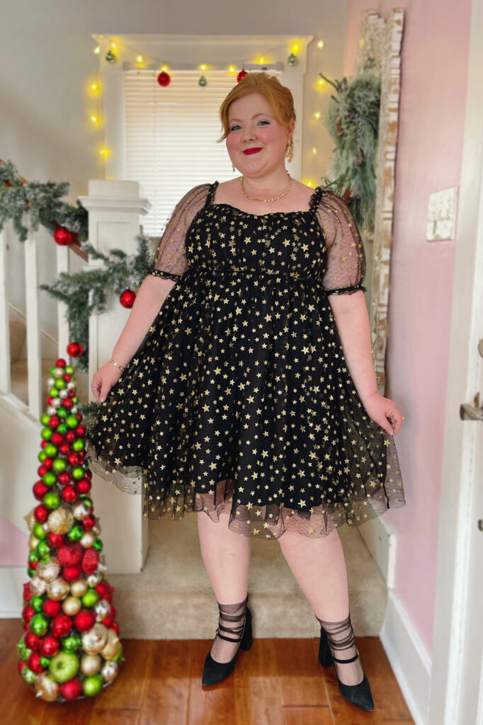 These looks are from a holiday campaign I shot with Unique Vintage. I’m wearing size 2X(18) in all pieces. The red top is a bodysuit, perfectly paired with this flared faux-leather skirt. Styled with candy cane earrings and red flats, it’s festive without feeling costume-y. The babydoll dress is a standout option for NYE—darling with black tights and gold shoes too. I accessorized with Kendra Scott jewelry, Anthropologie tulle socks, and black Mary-Jane heels (similar linked).
