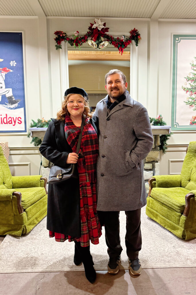 For a long day outside, I needed something warm but still festive. I wore the Ivy City Co plaid dress layered under my wool Ulla Popken coat. I left the coat open to showcase the plaid and added a tartan scarf in our family pattern. A black beret, fleece-lined tights, waterproof boots, a Coach Soft Tabby bag, and velvet ribbon hoops from Kendra Scott complete the ensemble.