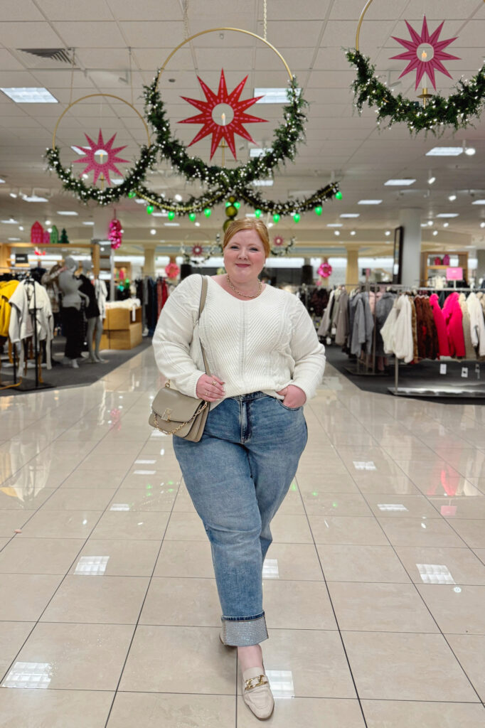 I loved this Lane Bryant sweater so much that I bought it in both cream and evergreen. I’m wearing the 18/20 in the sweater and an 18 in these high-rise jeans. The rhinestone-cuffed denim earned me so many compliments—just the right amount of sparkle for a casual weekend look. I paired it with my new Kate Spade Dakota handbag in the most versatile taupe. You can carry it by the top handle, the chain shoulder strap, or remove the strap entirely. My gold jewelry (earrings, necklace, statement ring, and pearl ring) is from Kendra Scott, and my loafers are Steve Madden from Nordstrom.