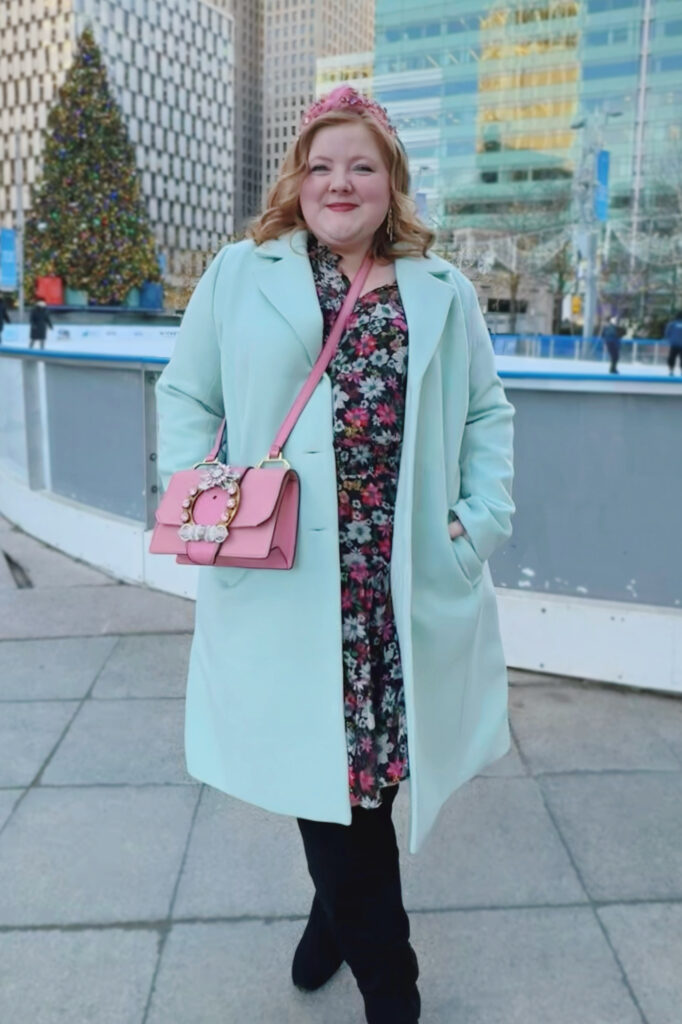 I picked up this floral top-and-skirt set from Draper James on our holiday trip to Nashville. I’m in the XXL for both pieces. The skirt hits above the knee without being too short, and the wide elastic waistband lets you adjust the rise. My pink jewel headband is from Lele Sadoughi, the green earrings from Kendra Scott, and my Miu Lady Bag was a luxury resale find—there’s a similar one currently on Vestiaire Collective. Nude Sheertex tights and wide-calf knee boots complete the look. My coat is an older Ulla Popken style, but I linked similar options.