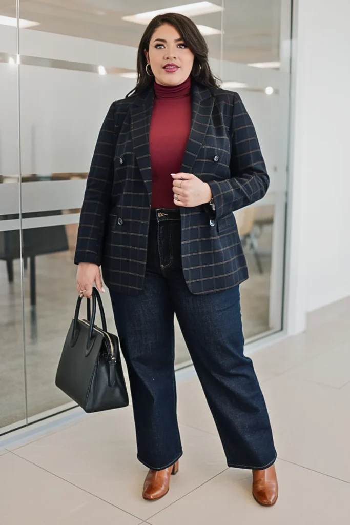 Layer a rich burgundy turtleneck beneath a tailored navy plaid blazer. Pair with dark-wash straight-leg jeans and cognac ankle boots. Add a structured black handbag and delicate gold jewelry for a look that’s warm, professional, and presentation-ready.