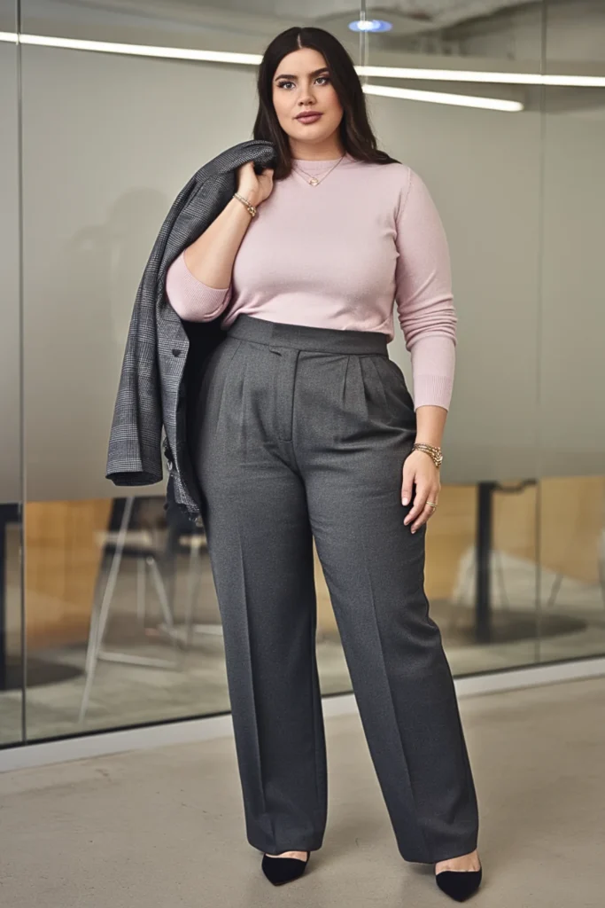 Pair a soft pink cashmere sweater with high-waisted gray trousers, black flats, and delicate gold jewelry. Add a blazer for meetings.