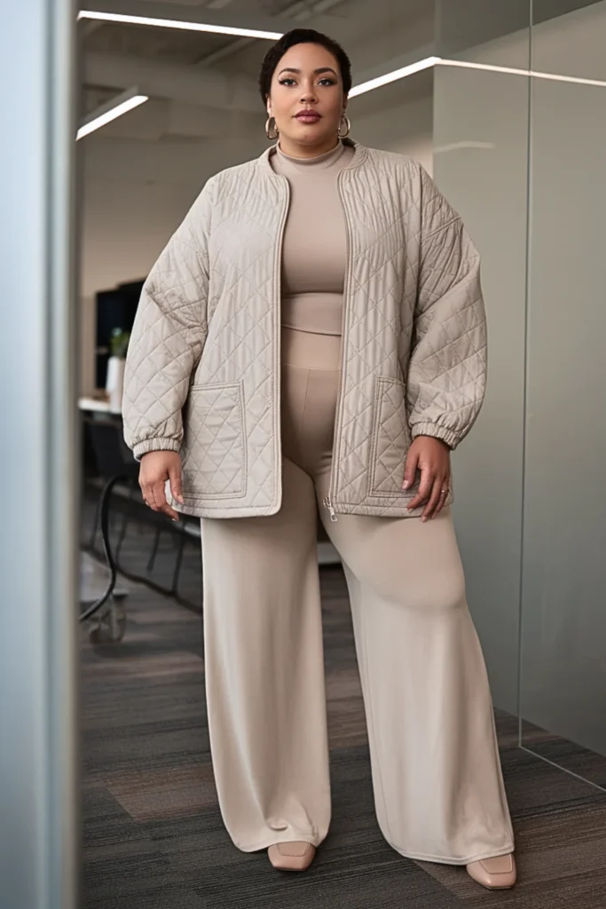 Opt for a beige quilted jacket layered over a fitted mock turtleneck and cream wide-leg trousers. Finish with loafers for a modern, minimalist outfit.