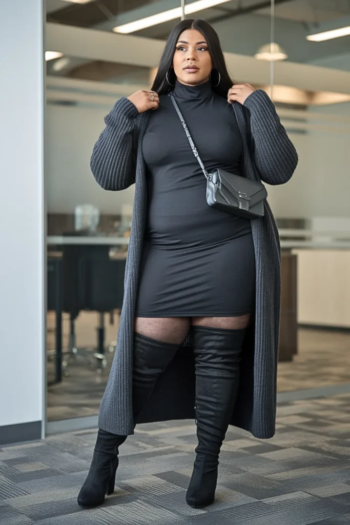 A charcoal cardigan coat over a black turtleneck dress, thick tights, and over-the-knee boots delivers warmth and a sleek silhouette.