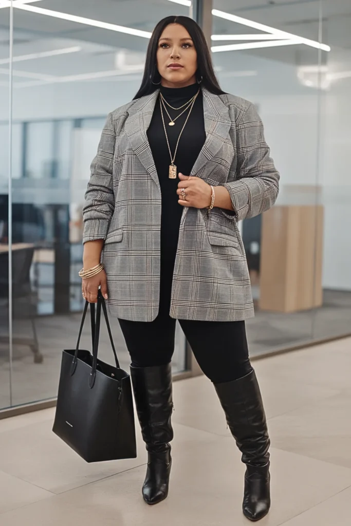 Pair an oversized plaid blazer with a long tunic and black leggings. Tall boots and layered gold jewelry keep this comfortable yet sharp.