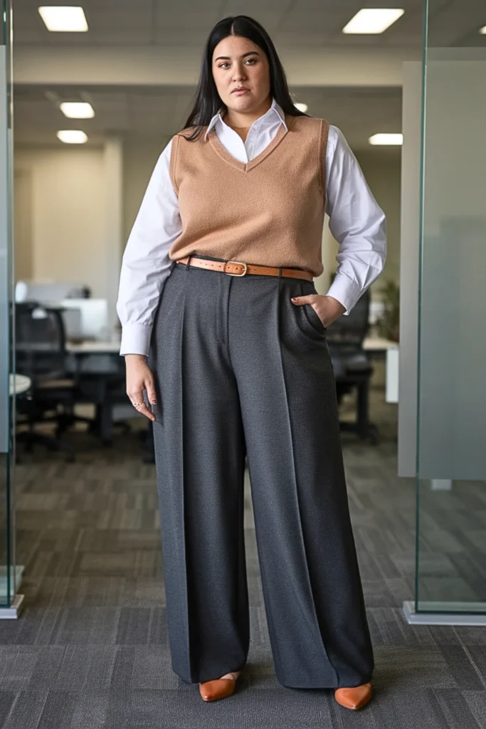 3. Camel Sweater Vest + Wide-Leg Trousers