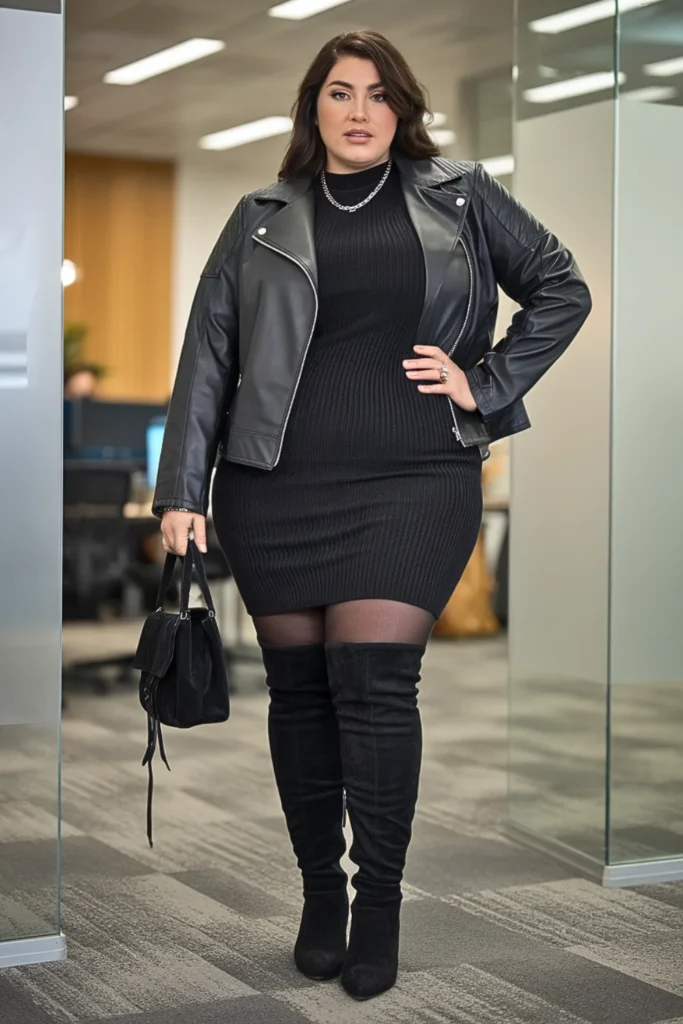 Slip a black moto jacket over a fitted ribbed sweater dress. Add thick tights, over-the-knee suede boots, and silver jewelry for a bold yet office-friendly edge.