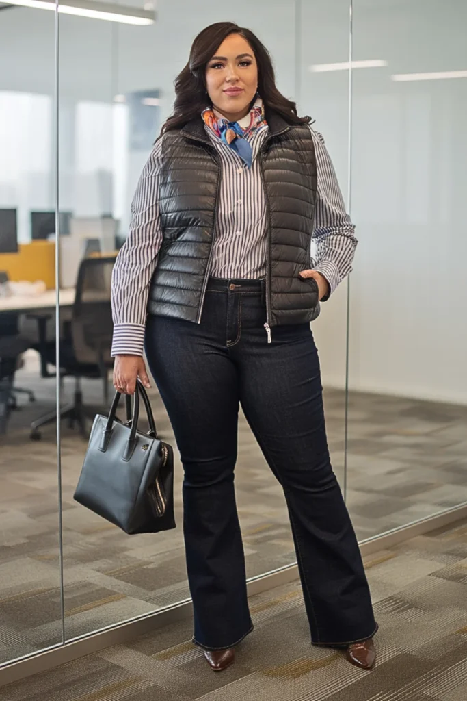 Style a black puffer vest over a striped button-down with dark bootcut jeans and ankle boots. Add a colorful scarf for casual Fridays or outdoor client visits.